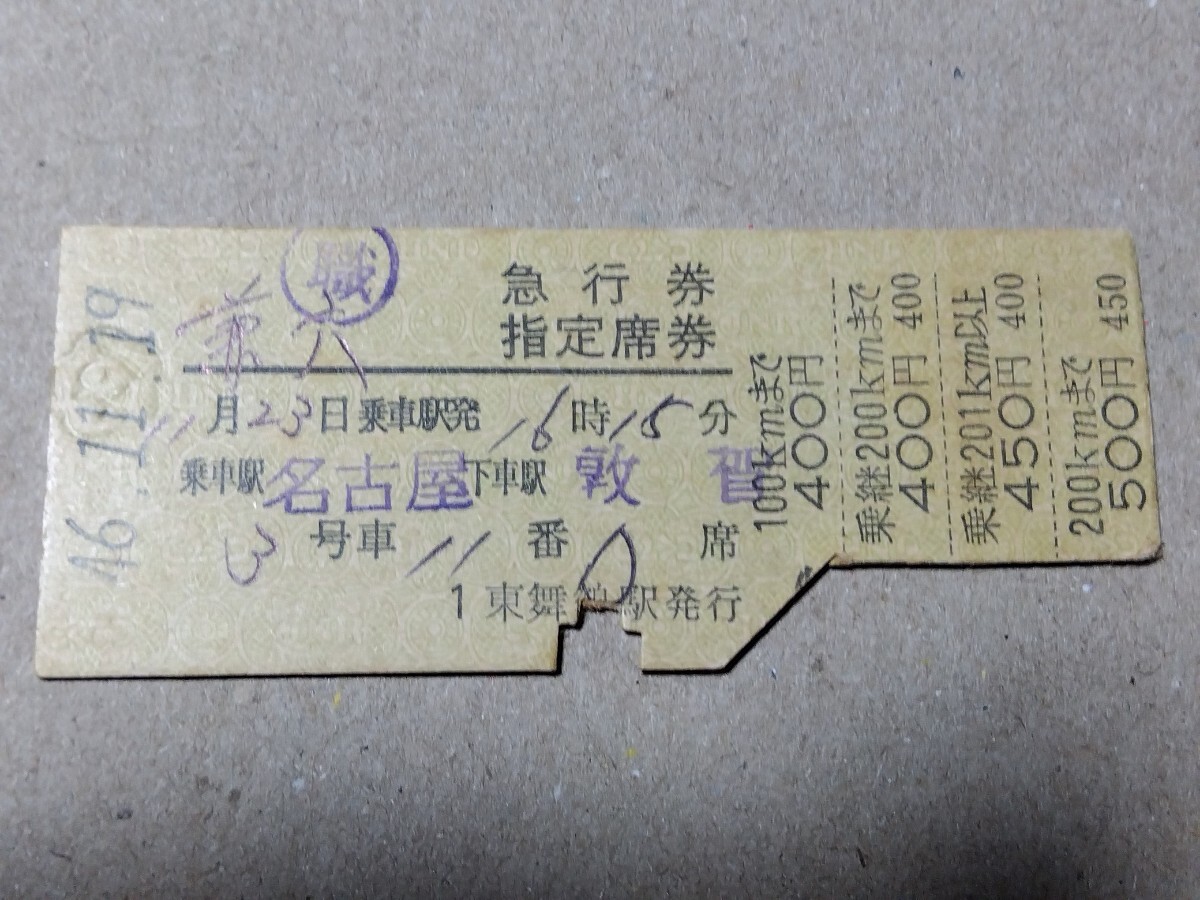 > 250315-70【国鉄きっぷ】D型硬券 名古屋→敦賀 兼六号急行券・指定席券 小児用 東舞鶴駅発行 昭和46年