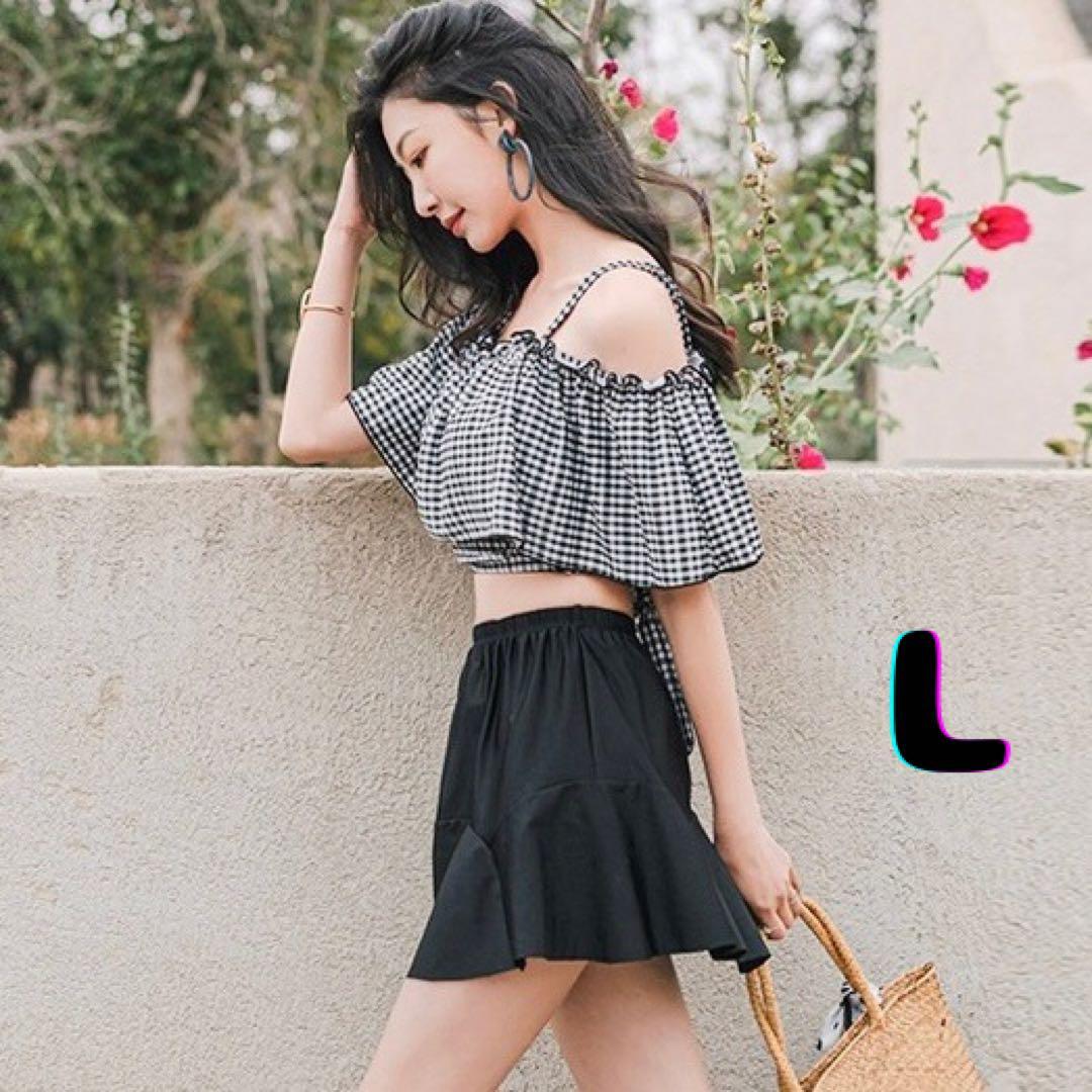 - L セパレート上下セット レディース 水着 黒 ギンガムチェック柄 体型カバーフリル リボン オフショルダー タンキニ スカート 露出控えめ