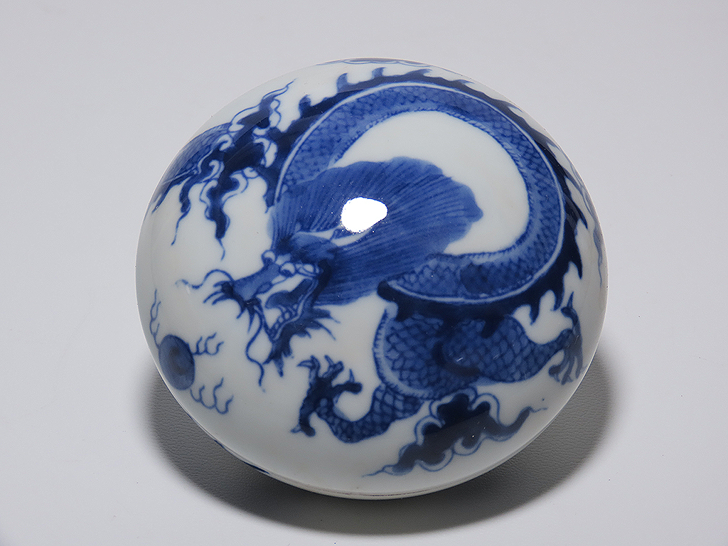 > 中国陶器.染付の龍の絵付け.香合.朱肉入れ.汚れありますが傷はありません.薄手取扱注意です。
