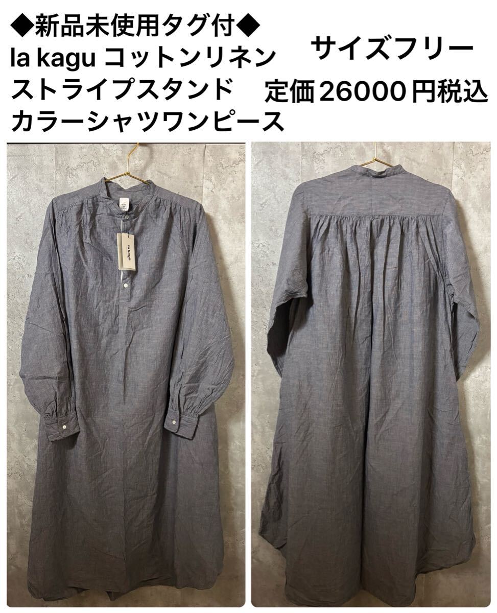 > ◆新品未使用タグ付◆la kagu コットンリネンストライプスタンドカラーシャツワンピース サイズフリー 定価26000円+税