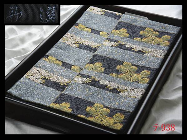 - 蔵【テ938】西陣逸品 唐織 歌選 市松松桜紋 藍鼠色地 淑やかに香る気品 正絹六通高級美術袋帯 ◇検◇簪着物名古屋帯和装小物帯締め
