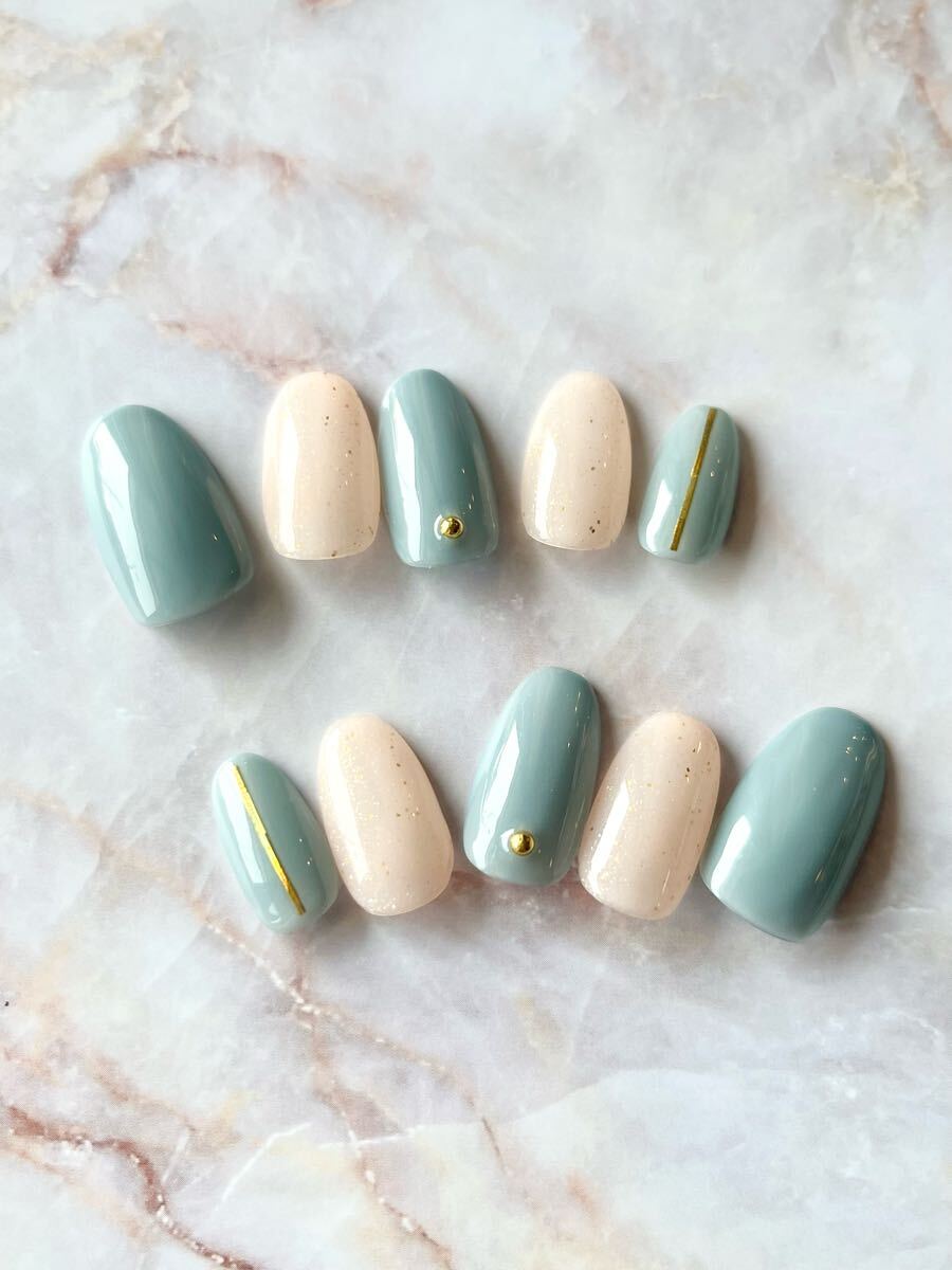 - ハンドメイド ネイルチップ レギュラーオーバル ブルー ミルクホワイト