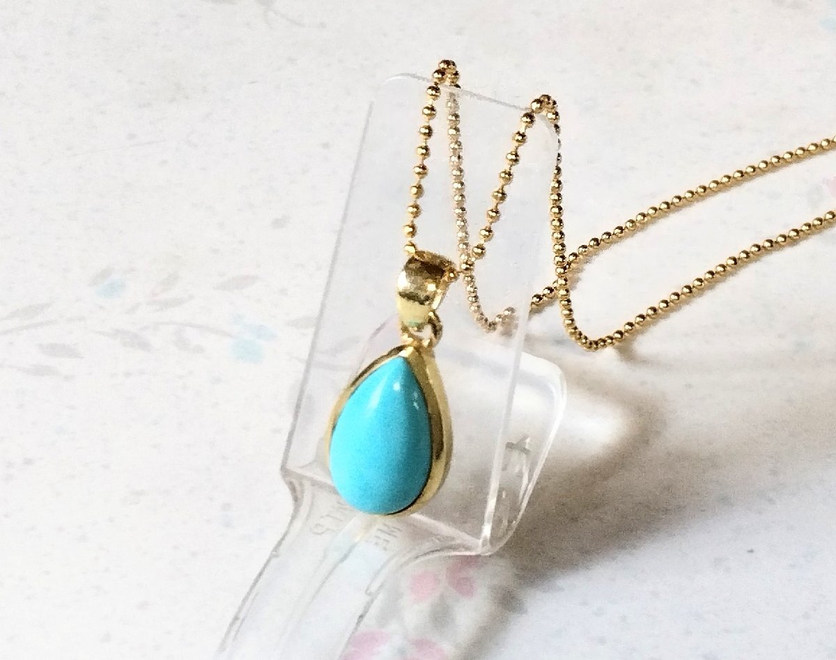 - 18kGP仕上げのドロップ型の素敵な3Aキングマンターコイズのゴールドネックレス
