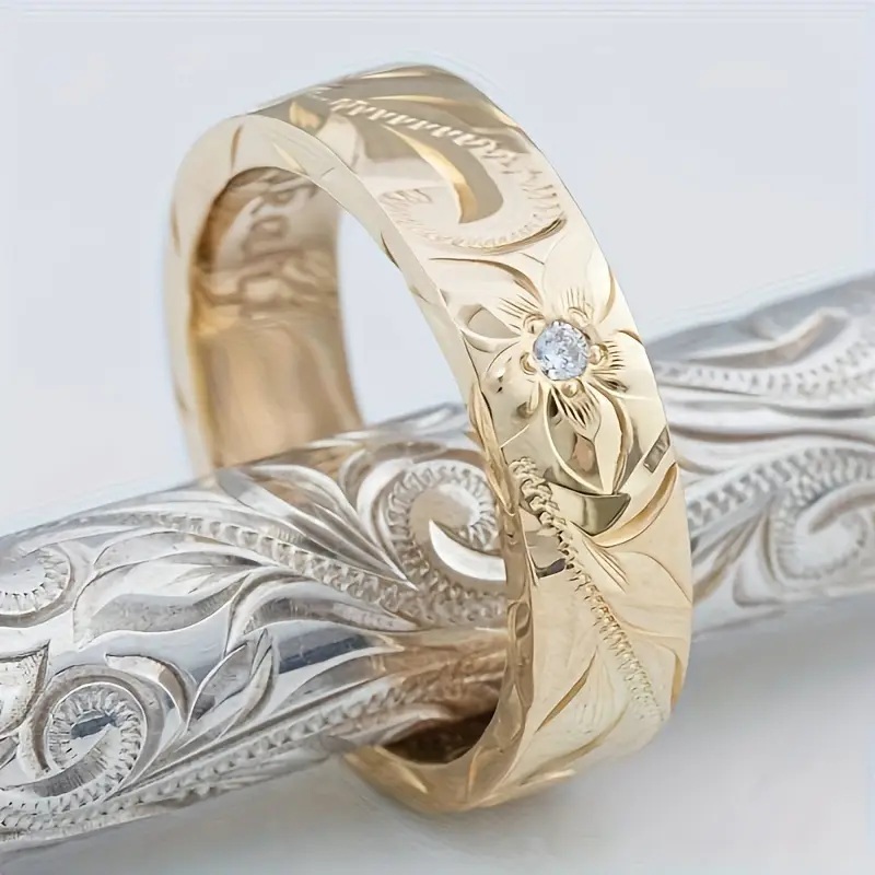 - プルメリアとスクロールの彫刻施されたリングハワジュ男女兼用4月の誕生石ジルコニアジュエリーアクセサリーついてお洒落幸福にという意味