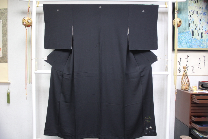 > きもの今昔8356 黒の礼装 喪服袷きもの広衿手縫い仕立 やや経年経過品 珍品 下前衽裾に柄刺繍有り 身丈148cm