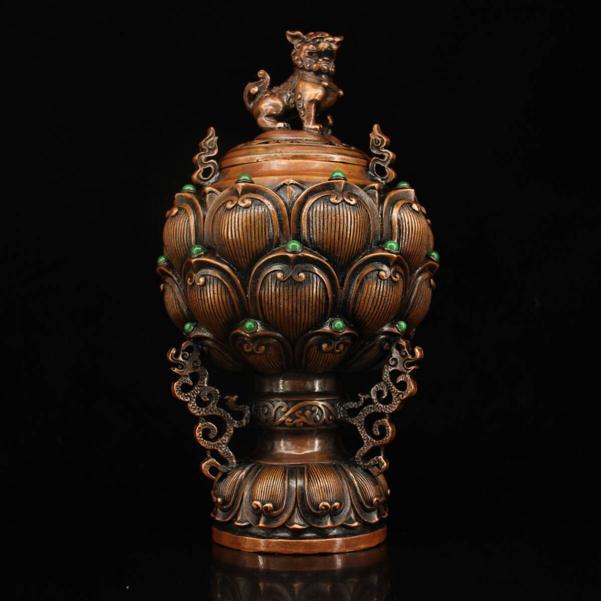 - 『館蔵珍品 銅製 寶石嵌 獅蓋熏香炉』置物 賞物 貴重物品 収蔵品 中国古美術