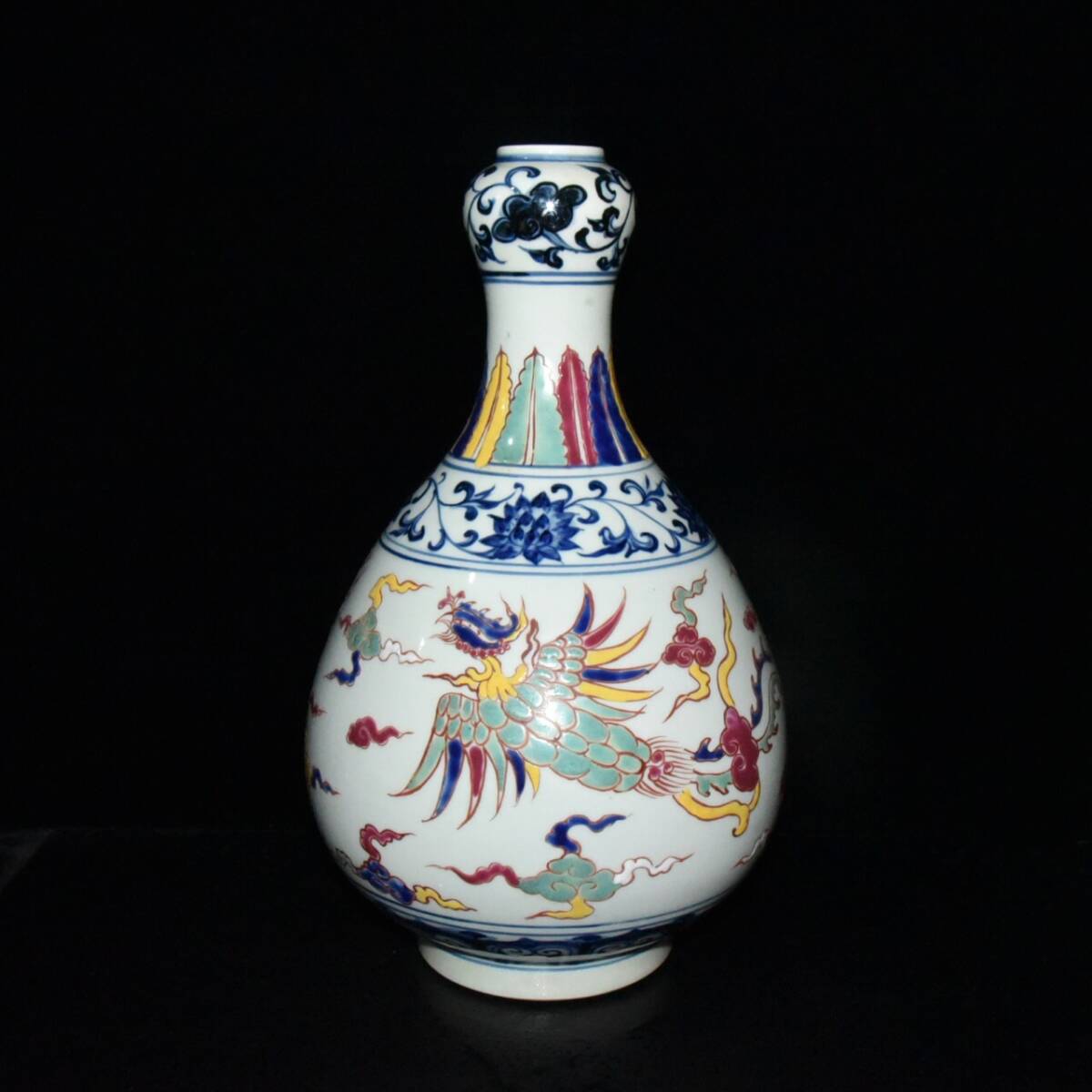 - 【超珍館蔵】明 宣德年製款 古陶瓷品 五彩 鳳紋 蒜頭瓶 置物 古賞物 古美術品 稀少珍蔵品