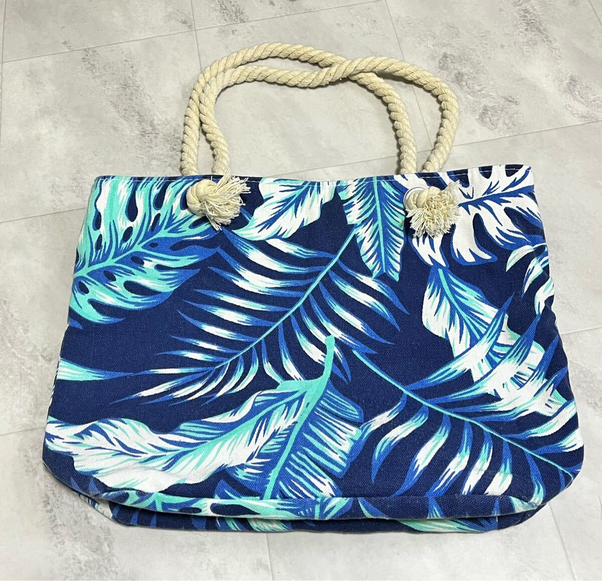 - トロピカル ジャングル リーフ柄 BIGトートバッグ ブルー エコバッグ