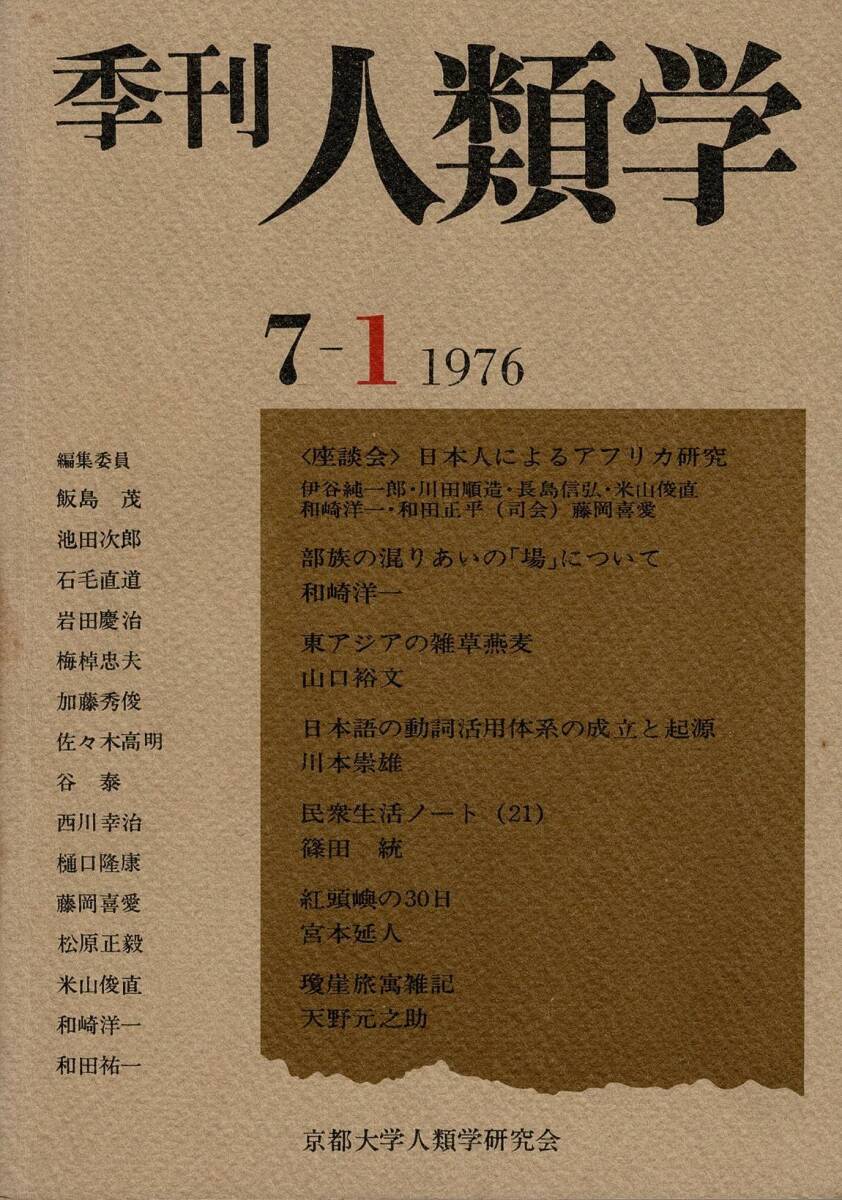 - *「季刊 人類学 1976 7-1」京都大学人類学研究会 A5 237p 座談会:日本人によるアフリカ研究/東アジアの雑草燕麦など RI325UT01