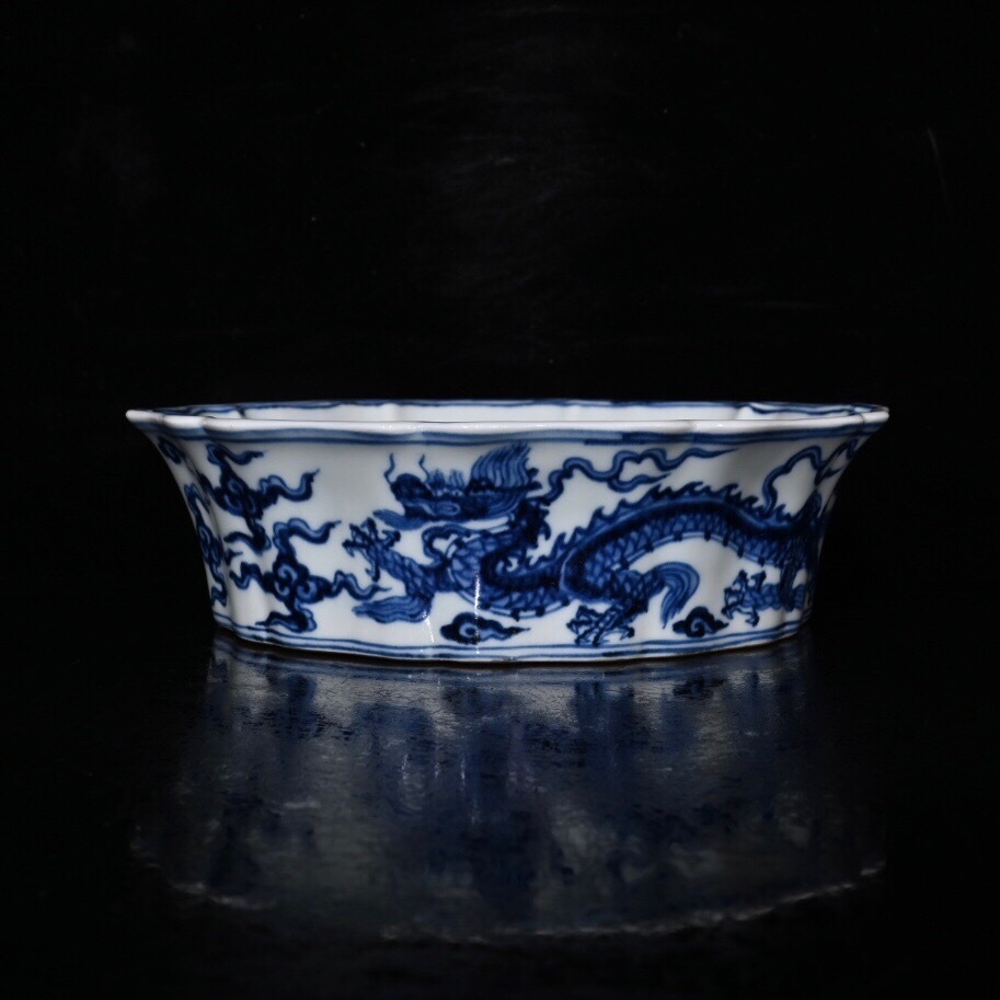 - ▽鴻▽ 明 宣德年製款 青花 一束蓮龍紋 筆洗 古陶瓷品 置物 古賞物 中国古玩 中国古美術