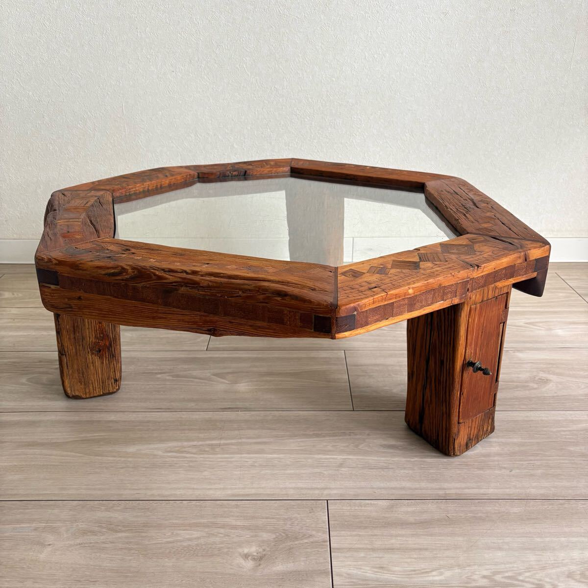- アメリカビンテージ 7角形3本脚 未製材無垢材 ガラスローテーブル アートピース 象嵌 プリミティブ
