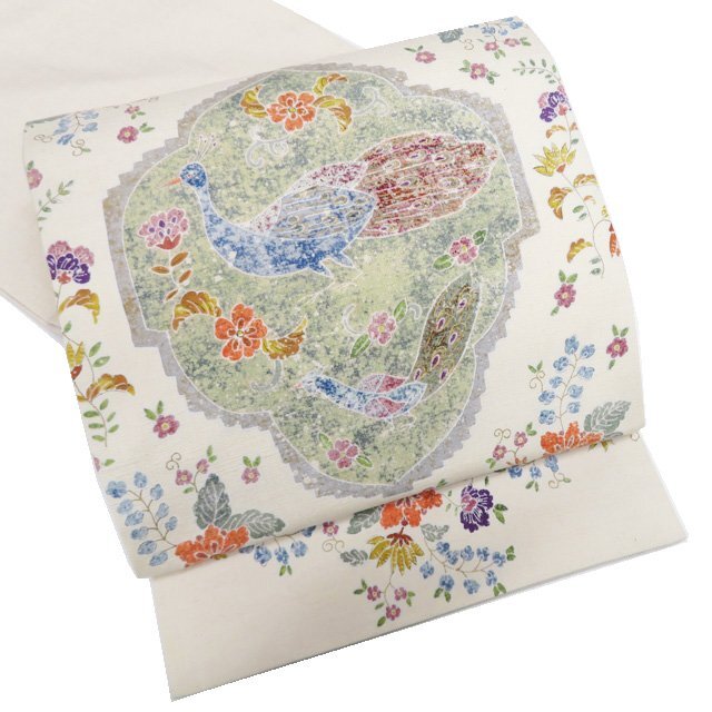 - 袋帯 中古 リサイクル 正絹 紬地 カジュアル 仕立て上がり 作家物 落款 お太鼓柄 花鳥の図 孔雀 生成色 多色 きもの北條 A1171-10