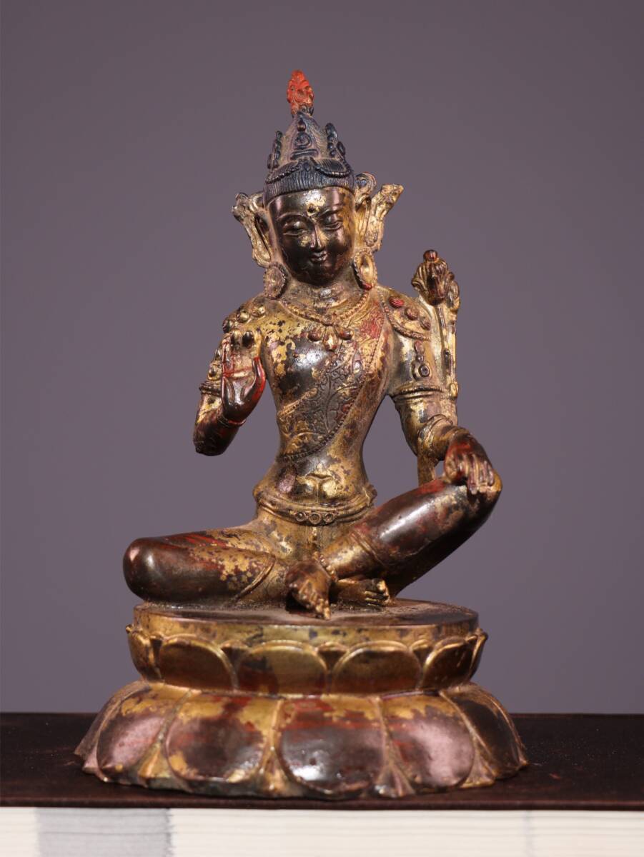 - ▽鴻▽ 銅製 泥金 朱砂 自在觀音像 置物 古賞物 中国古玩 中国古美術
