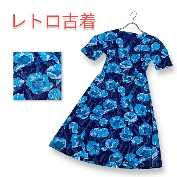 - 【レア】昭和レトロ ワンピース サイケ 総柄 花柄 ブルー系 ヴィンテージ ゆったり エレガント オートクチュール 特注品 匿名配送