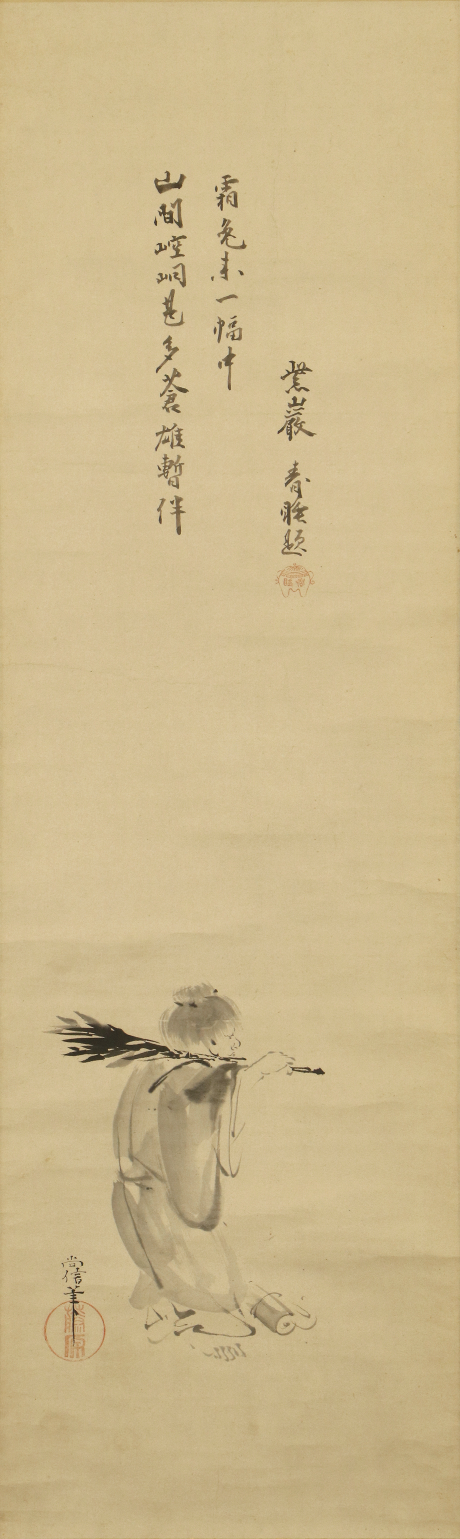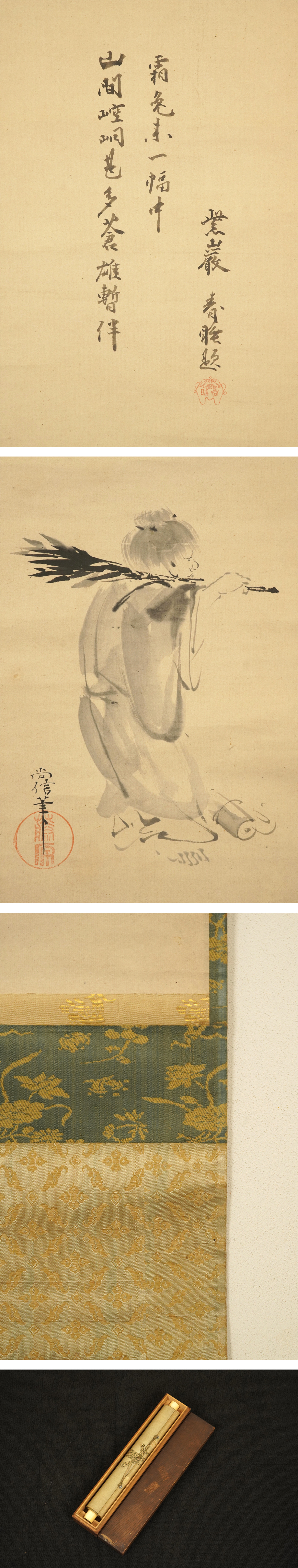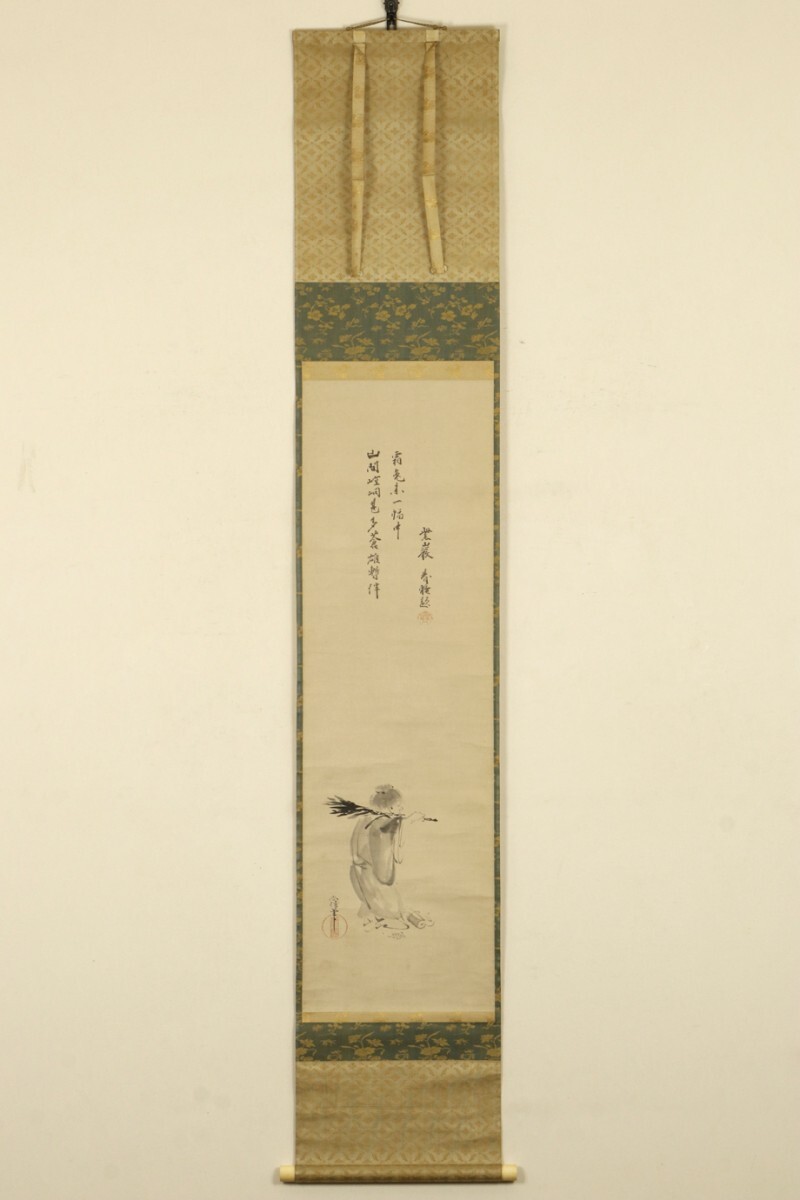 - 【真作】掛軸「狩野尚信画 玉舟宗璠賛 寒山画賛」江戸前期 幕府奥絵師 臨済宗僧 探幽弟 常信父 木挽町狩野家 大徳寺 書画