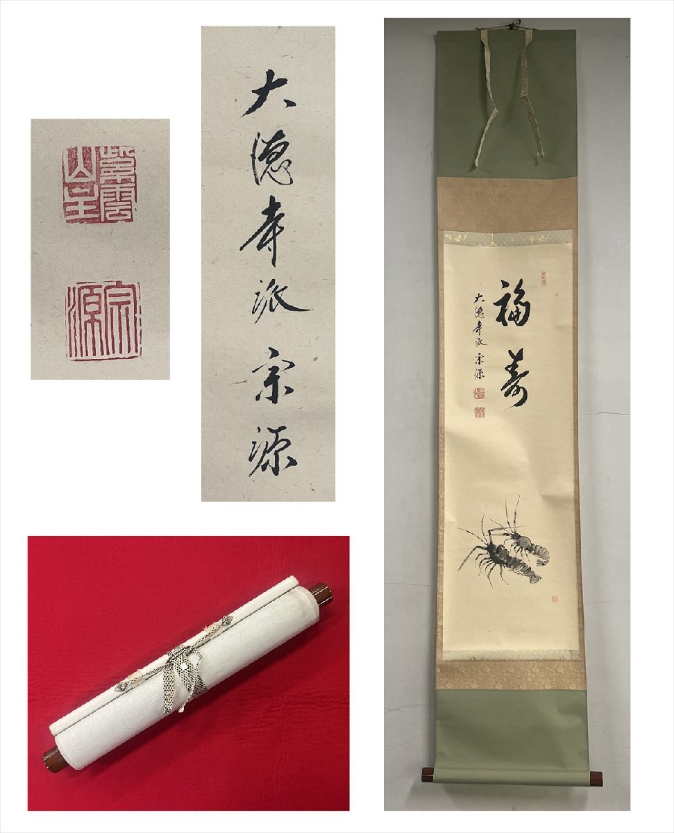 - 【千寿】大徳寺派 瑞光院 前田宗源 福寿 伊勢海老画賛 紙本 a417◆茶道具 古美術 時代品 掛軸 100017805