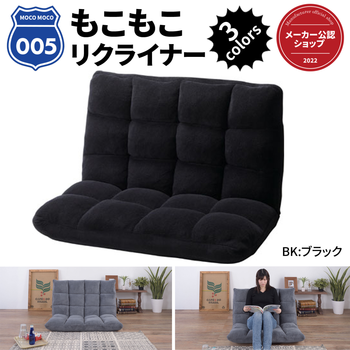 > モコモコ リクライナー 座椅子 ゆったり ワイド 幅 84センチ 2P 14段階リクライニング ソファ ブラック FKC-005BK