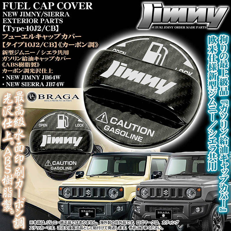 > タイプ10J2/CB/給油 フューエル キャップ カバー/ABS樹脂製/カーボン調/光沢/新型ジムニー ロゴ カッティングステッカー付/客注品/ブラガ