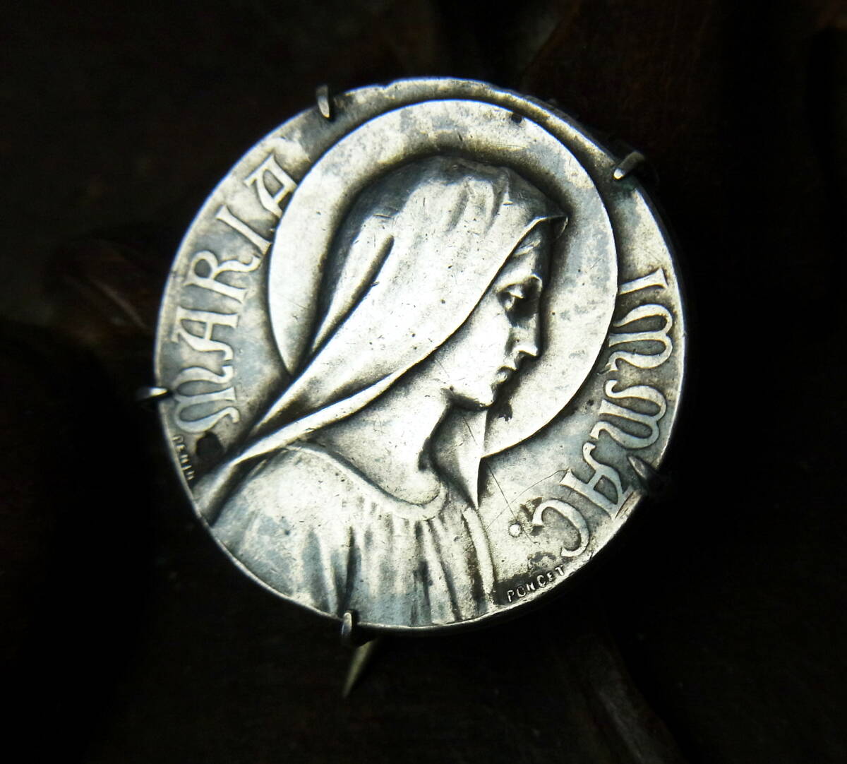 > 貴重逸品 19世紀後期 純銀シルバー800 聖母マリア メダイ 彫刻家 PENIN/PONCET ペナン/ポンセ 共作 ブローチ 聖品 フランスアンティーク