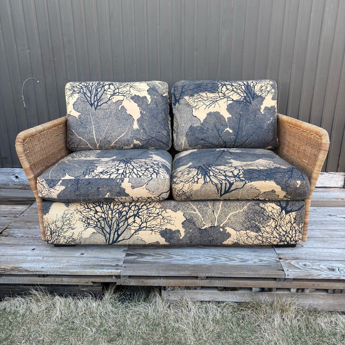 - ジャパンビンテージ コスガ社製 ラタンアーム 輸入樹木柄ファブリック 2人掛け ラブシート