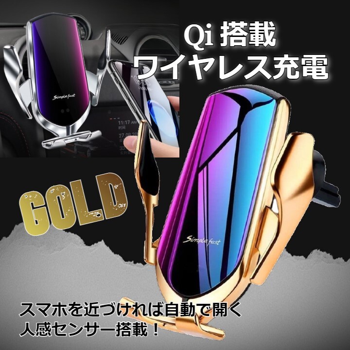 - 車載ホルダー Qi 急速ワイヤレス充電 スタイリッシュなデザイン ゴールド