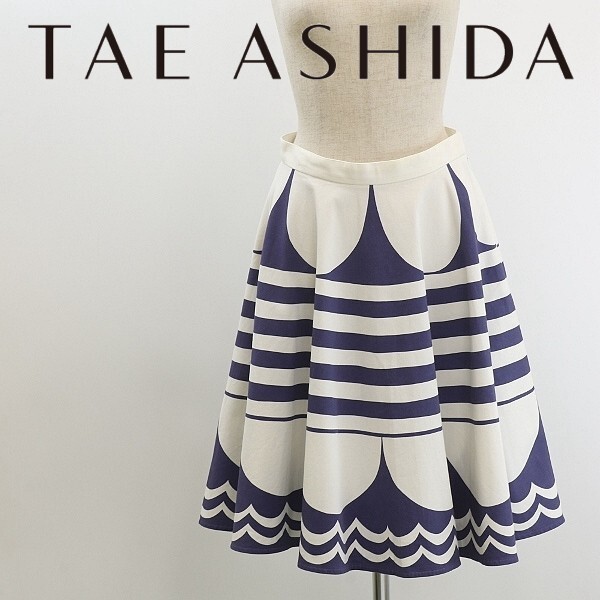 - ◆TAE ASHIDA タエアシダ ボーダー 総柄 ストレッチ コットン フレア スカート ホワイト×ネイビー 9