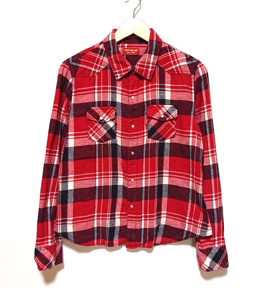 - h2477gg Levi's(リーバイス)サイズL 長袖シャツ チェックシャツ レッド×ネイビー×ホワイト レディース カジュアル 綿100% 着まわしコーデ