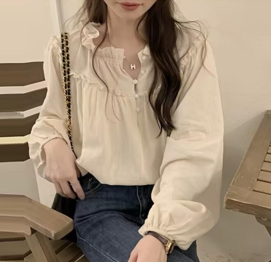 > 春夏新入荷 *シンプル ゆったり ブラウス 長袖 レディース tシャツ シフォン シャツ トップス カジュアル おしゃれ 通勤 ブラウス*杏