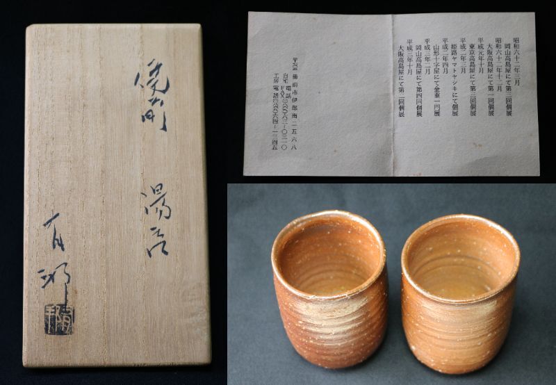 - 金重有邦「備前湯呑x2個」共箱 栞 黄布