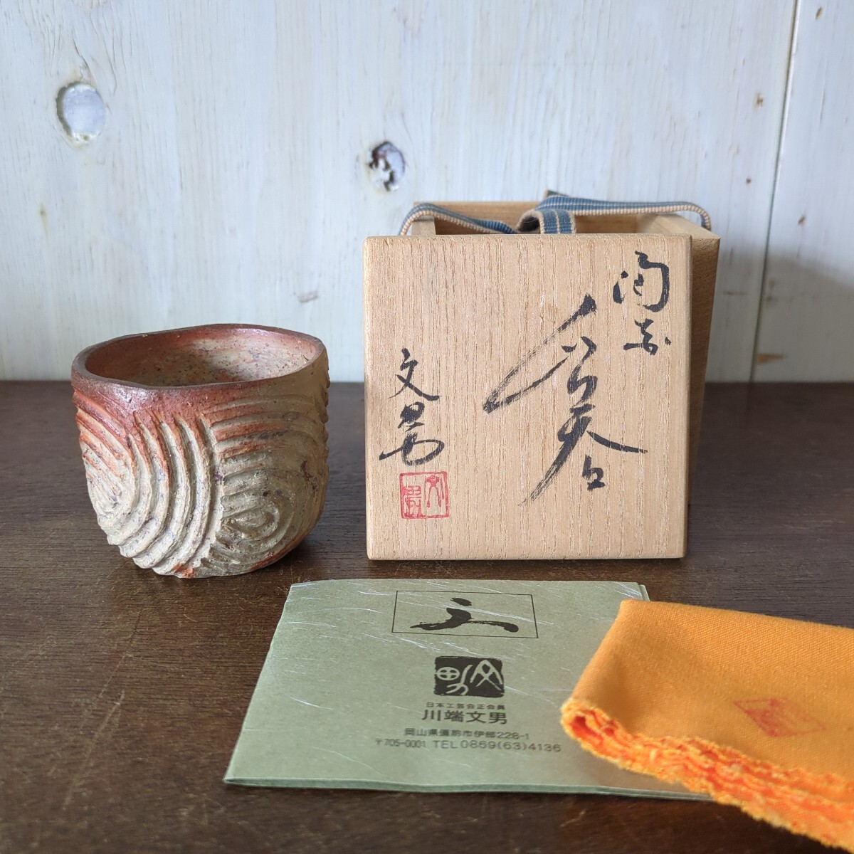 - 備前焼 川端文男 自然練込 ぐい呑 栞 共布 共箱 酒器 酒杯