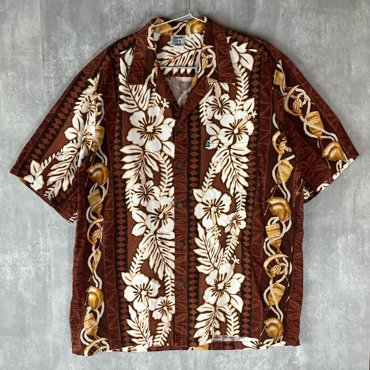 - 【USA製】Hawaiian Kine 90's 希少 アロハシャツ 柄シャツ 半袖シャツ ハワイアン ブラウン 総柄 90's ビンテージ