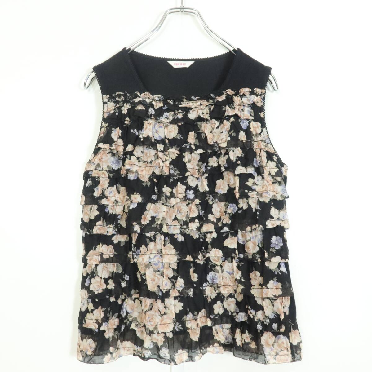 - 【美品!】ピンクハウス★かぶせ段々ローンブラウス ノースリーブ 大きいサイズ4(L) 黒系 はしごレース&花柄♪z