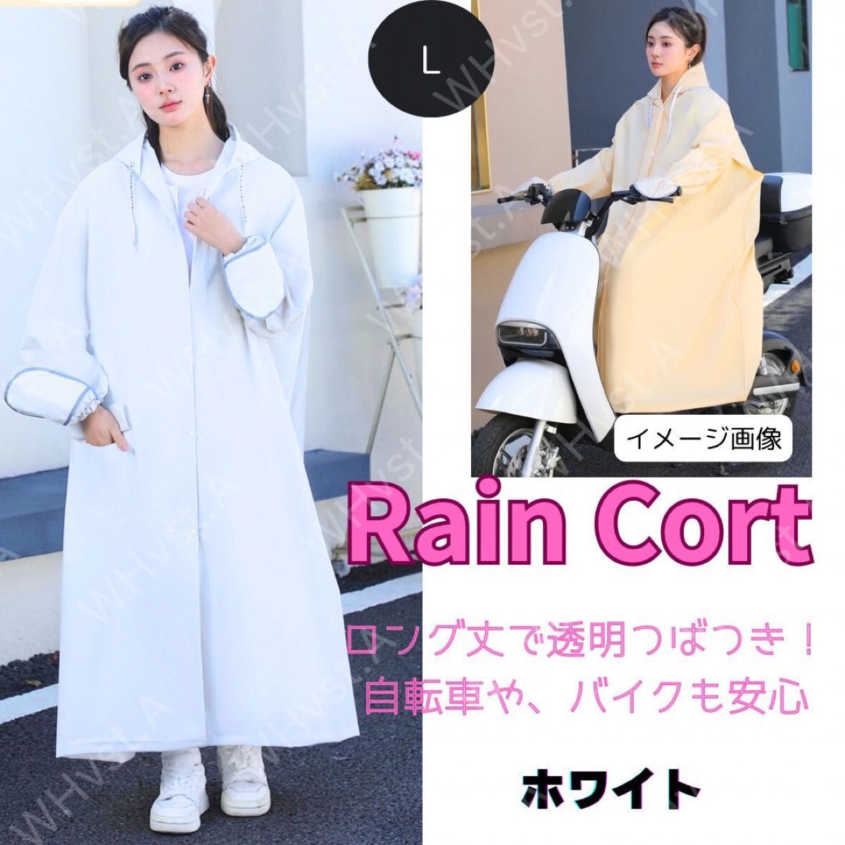 - ロング丈 防水レインコート ハンドカバー付き ホワイト L レインコート レインウェア かっぱ レディース