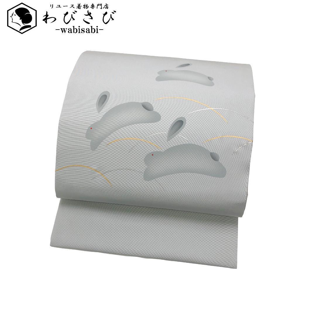 - 名古屋帯 塩瀬 兎 うさぎ柄 芝模様 金銀彩 灰色 O-4994 着物 きもの kimono 和服 和装 中古 リサイクル着物 【送料無料】