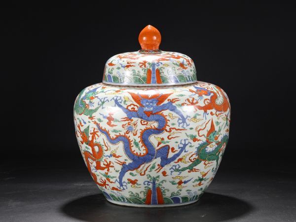 - 「明 嘉靖年製 陶磁器 五彩海水龍紋大蓋罐」染付 置物 擺件 古賞物 中国古美術 旧蔵出