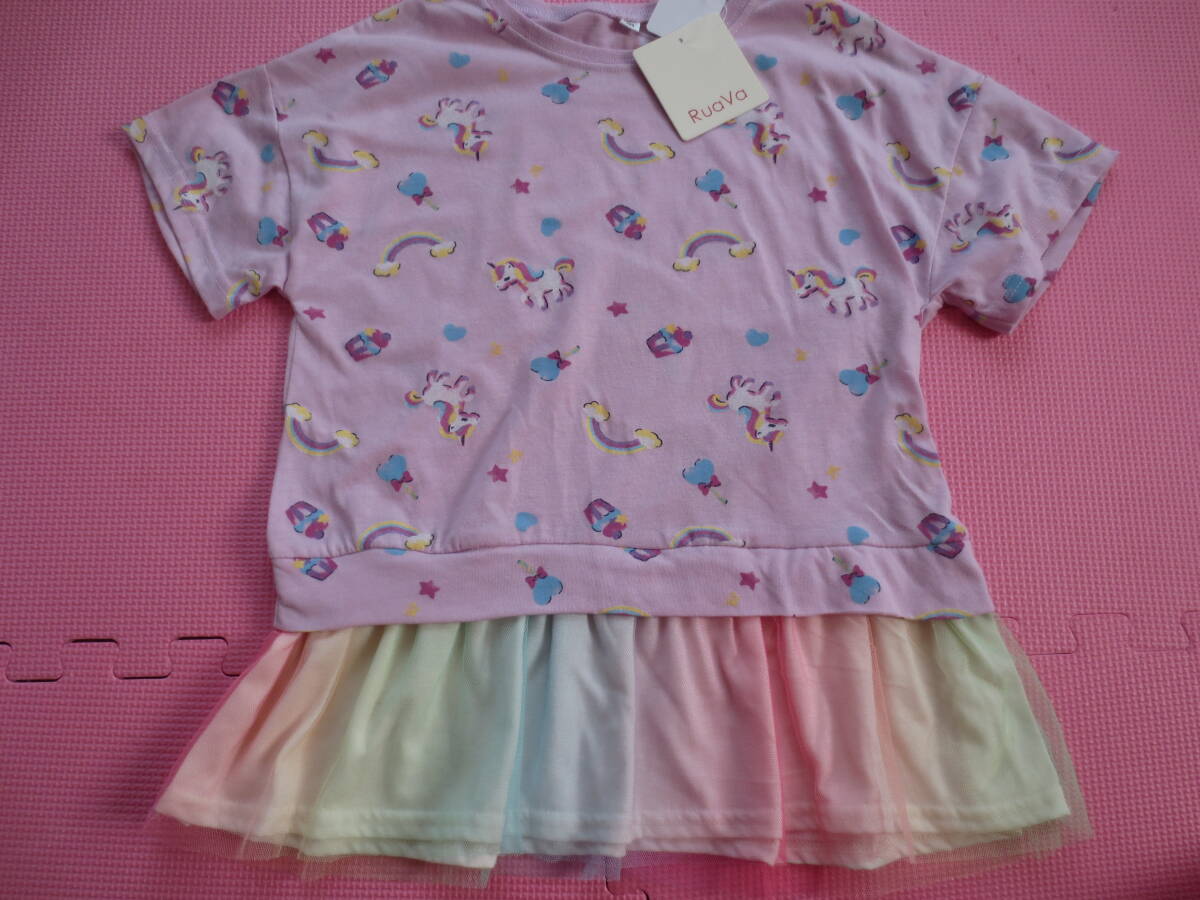 - 新品 130 レインボーチュールレース 半袖Tシャツ 紫ピンク ユニコーン 虹色ゆめかわプリント 小学生 女の子 双子 姉妹 夏物 120〜 送料無料