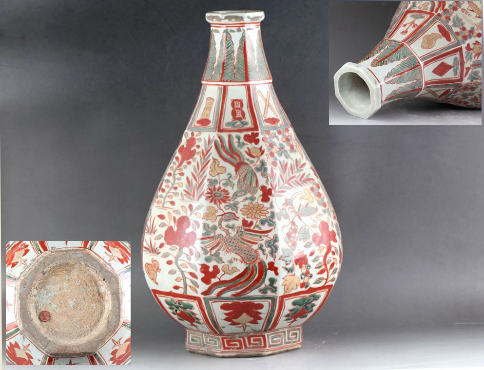 - 中国美術 元時代 釉里紅 纏枝花卉鳳凰紋 特大八角玉壺春瓶・古陶磁器 ・珍品旧蔵・古賞物