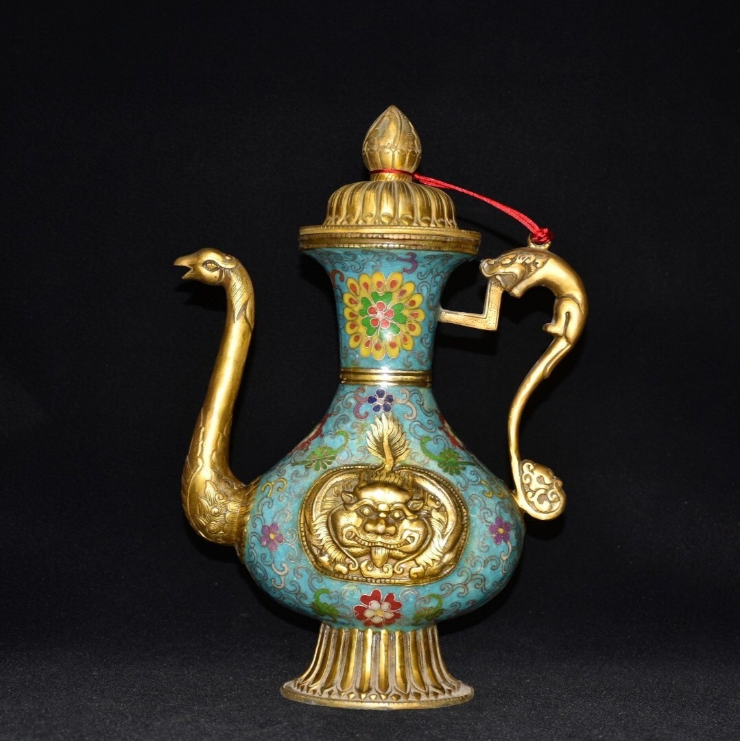 - ▽鴻▽ 銅製 景泰藍 琺瑯彩 塗金 獣頭端把酒壺 置物 賞物 古賞物 中国古玩 中国古美術