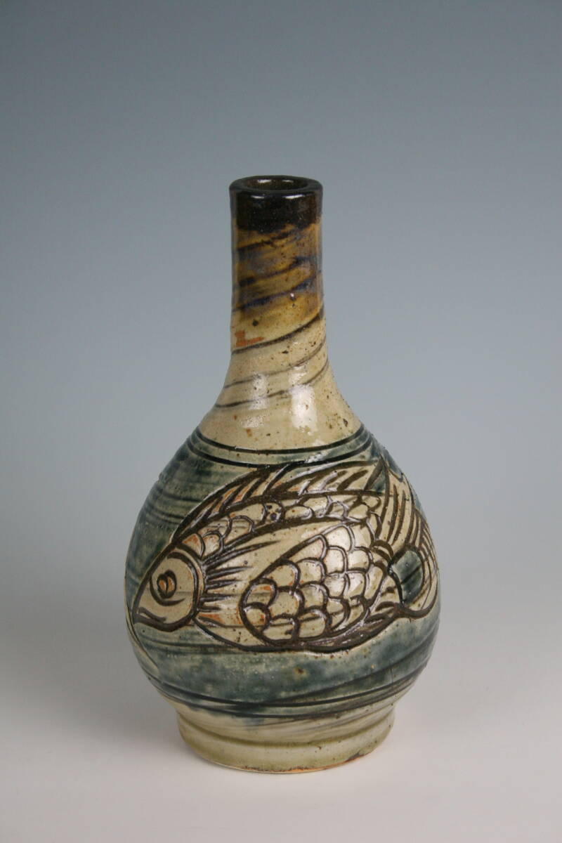 - 壺屋焼 人間国宝 金城次郎 作 呉須魚文鶴首花瓶(中)