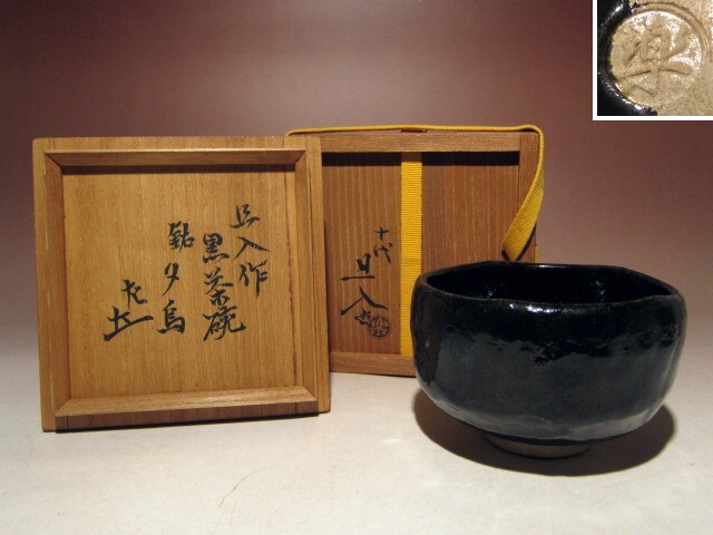 - 楽十代旦入 黒茶碗【夕鳥】★惺斎花押★ニュウあり格安スタート★a503