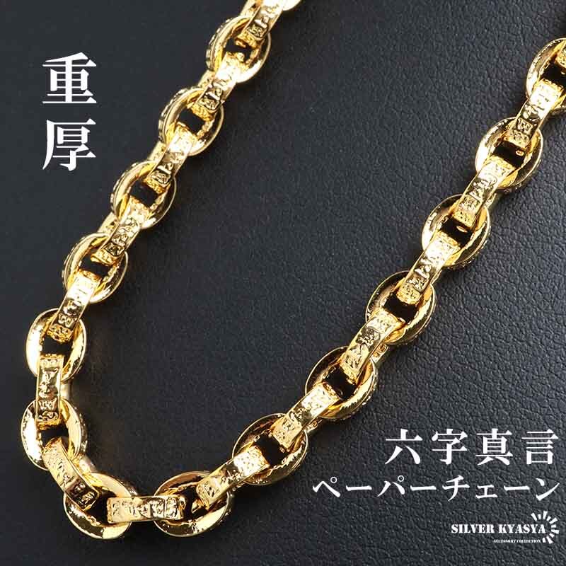 - (60cm) 18k 金 仕上げ 梵字 ペーパーチェーンネックレス 六字真言ネックレス 幅5mm メンズ チェーンネックレス