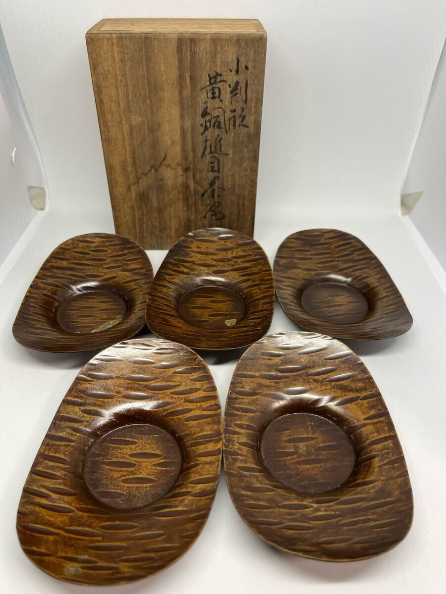 - 【骨董品】漆器皿 5枚セット 金色の葉模様 木箱付き 11.5cm×7.7cm 約58g