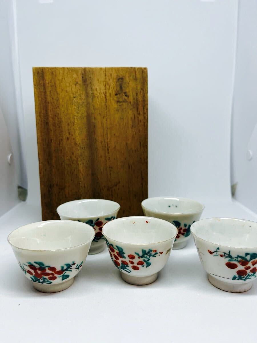 - 【骨董品】陶器製 湯飲み 5個セット 花柄 有田焼 九谷焼 時代物 湯呑 茶器 保管品 染付