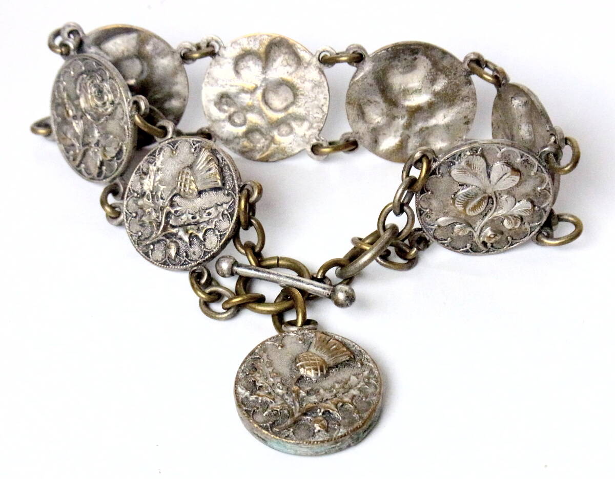 - フランスアンティーク メダイが連なるブレスレット クローバー アザミ バラ フローラル 鍍銀 チェーン コスチュームジュエリー 西洋骨董