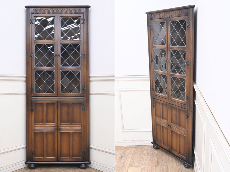 - HU12 アンティーク 英国製 イギリス クラシック ステンドグラス コーナーキャビネット オーク 飾り棚 食器棚 ガラス キャビネット 本棚