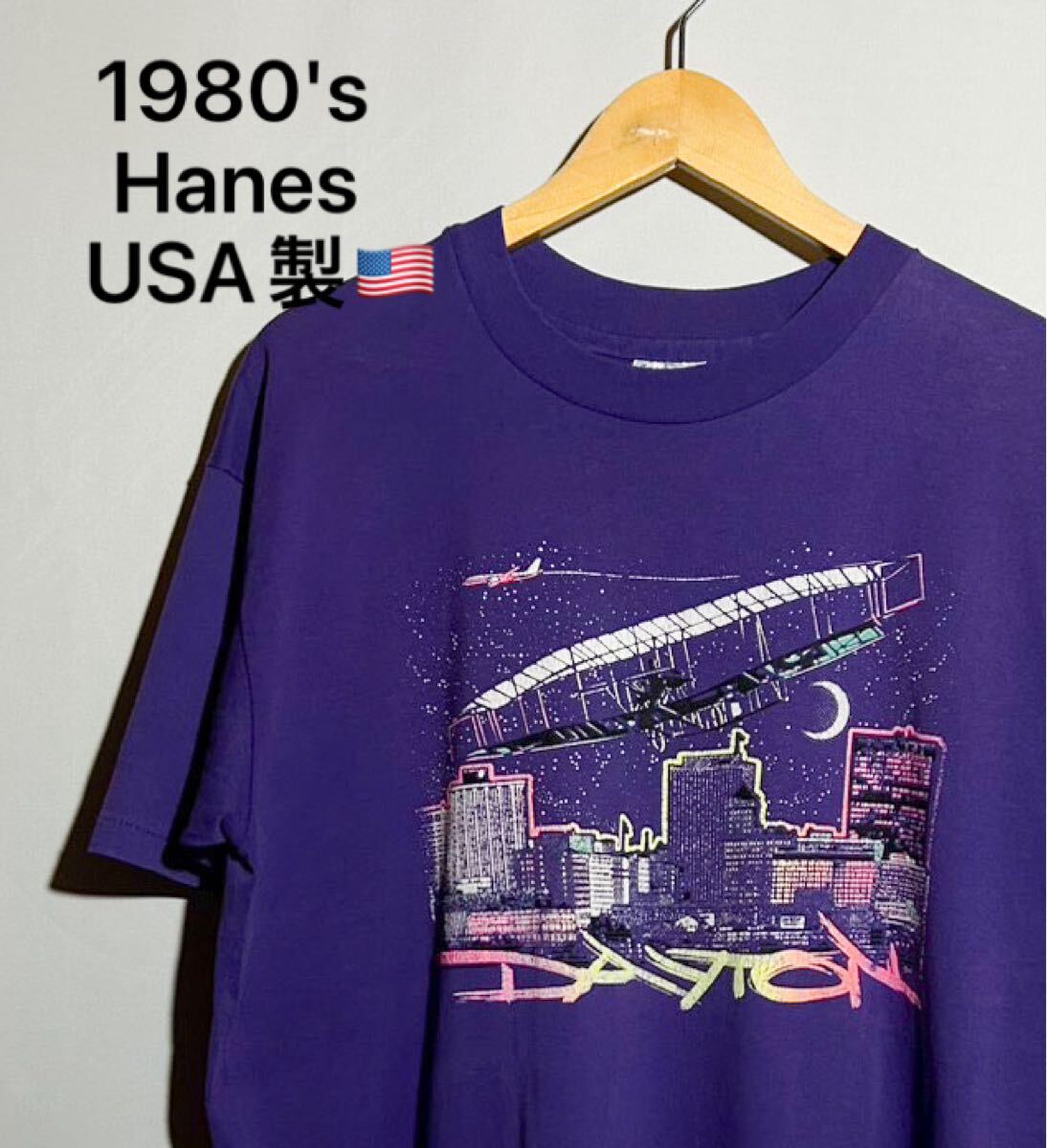 > USA製 80's 1980年代 Hanes ヘインズ ヴィンテージ Tシャツ パープル 紫 シングルステッチ ネオンカラー Dayton プリント 夜景 アメリカ