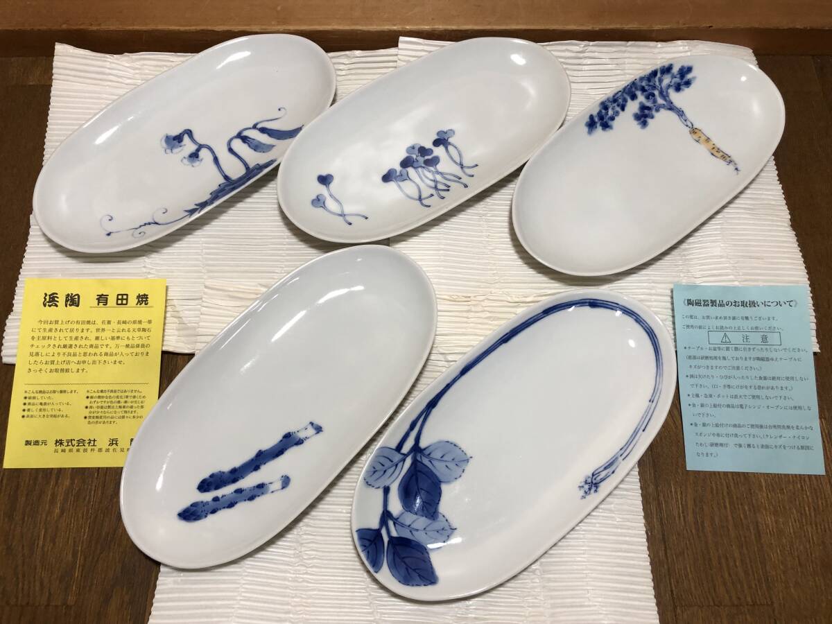 > 【送料無料】有田焼和山窯手描染旬菜惰円焼物皿 5柄組 製造元株式会社浜陶 波佐見焼 5枚 工芸品 陶磁器 未使用個人宅保管品 約25×12.5cm