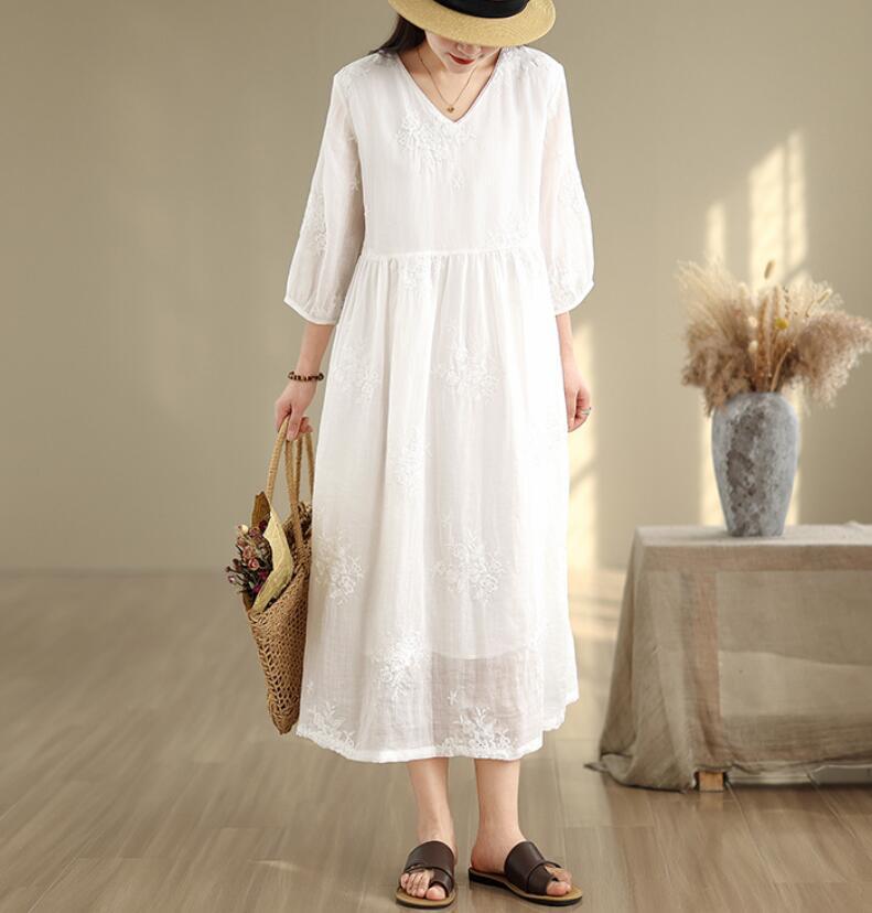 - 夏新入荷*五分袖 ワンピース きれいめ 上質 刺繍入り ロングワンピース vネック フレアワンピース aラインワンピース *白*