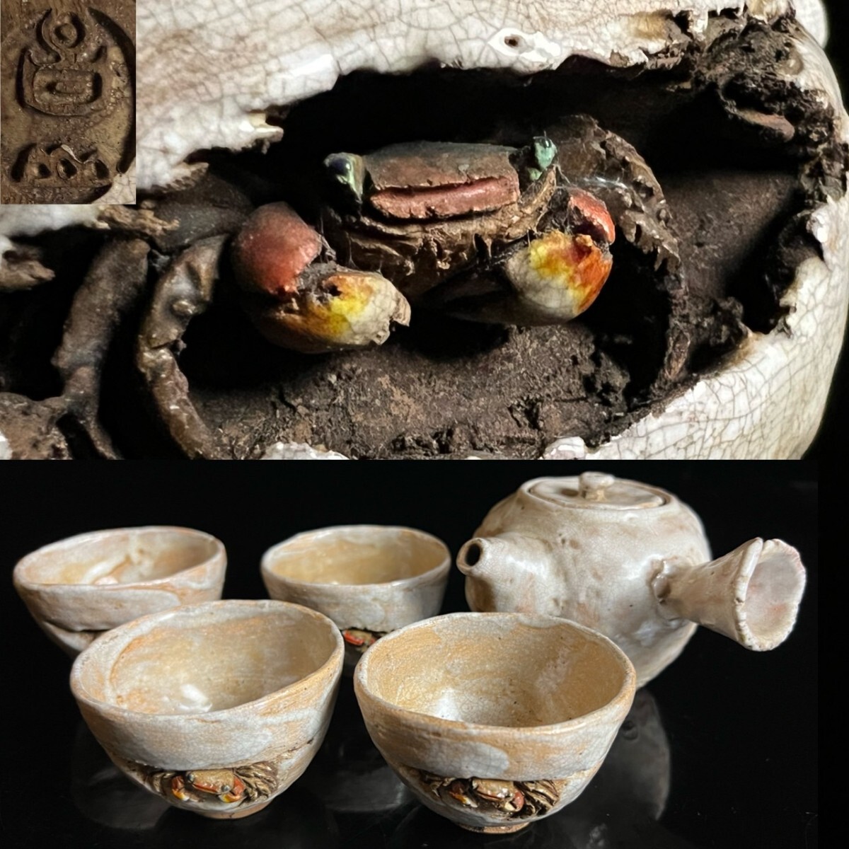 > ◇鸛◇ 古美術品 楽山焼 天神蟹刻茶器揃 5点纏めて 細密彫刻 煎茶器 煎茶道具 急須 茶器 唐物骨董