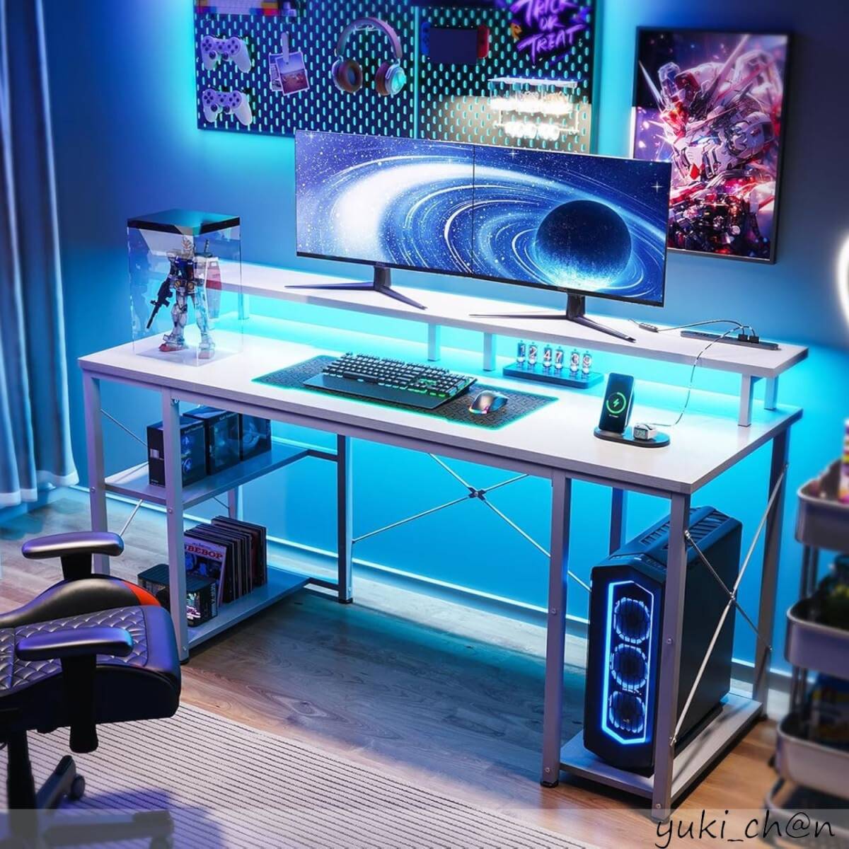 > ゲーミングデスク パソコンデスク ゲームデスク ワークデスク 幅140cm コンセント&LED付 両側ラック&モニター台付き 左右入れ替え ホワイト